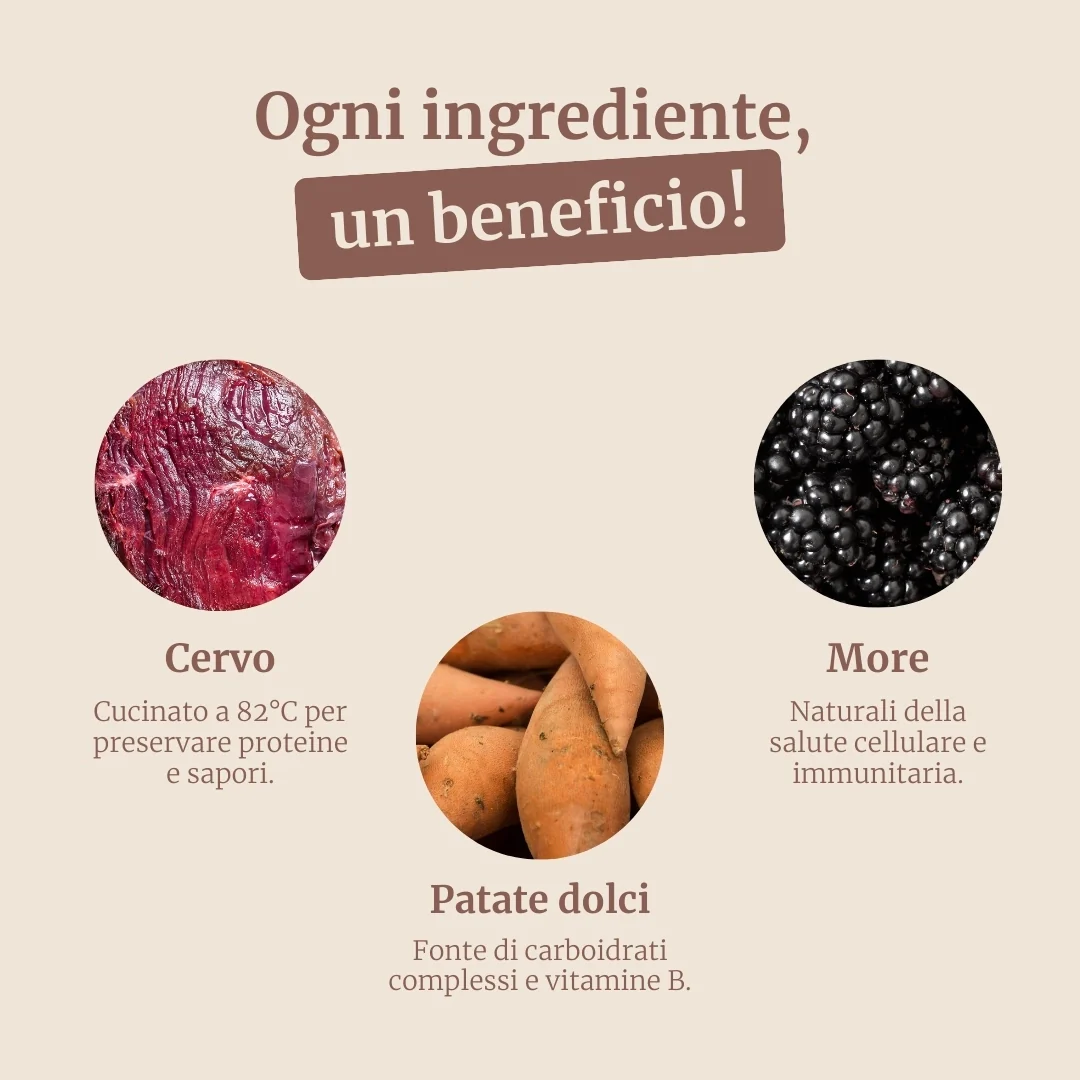 Questo pasto rappresenta un vero e proprio trattamento gourmet per il tuo peloso, combinando ingredienti pregiati come il cervo e il salmone con la dolcezza naturale delle patate dolci e l'apporto nutritivo delle more. Ogni ingrediente è stato scelto non solo per il suo valore gustativo ma anche per i suoi benefici per la salute, garantendo un pasto completo che nutre l'organismo e delizia. La formula equilibrata supporta lo sviluppo muscolare, la salute delle articolazioni, il sistema immunitario e la bellezza della pelle e del pelo, tutto mentre offre un'esperienza alimentare eccezionale. La cura nella selezione degli ingredienti e nel processo di cottura assicura che ogni boccone sia un concentrato di gusto e benessere, rendendo ogni pasto un momento speciale per il tuo amico a quattro zampe.
