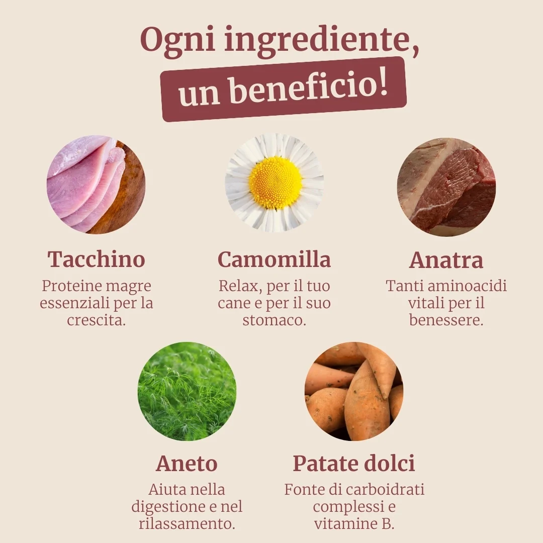 Questo pasto è una vera coccola per il tuo cucciolo, combinando la squisitezza del tacchino e dell'anatra con i benefici nutrizionali delle patate dolci, arricchito dagli effetti digestivi e calmanti di aneto e camomilla. La selezione accurata degli ingredienti garantisce un apporto bilanciato di proteine, carboidrati e vitamine, indispensabili per la crescita sana del tuo cucciolo. La nostra formula, priva di coloranti e conservanti artificiali, è stata sviluppata con un attento processo di cottura che preserva il gusto naturale e l'integrità nutrizionale degli alimenti, rendendola non solo deliziosa ma anche estremamente salutare.